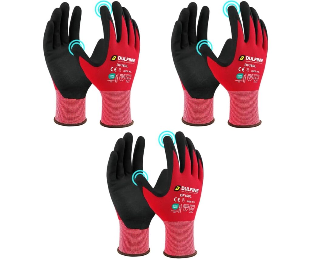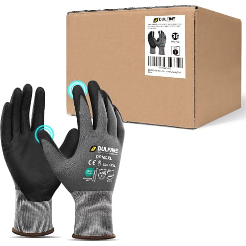 DULFINE gloves usually follow standard sizing (Small to X-Large). Check the brand’s sizing chart if available, and consider the fit you prefer—snug for precision tasks or looser for comfort in heavy-duty work.